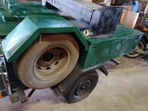 FKÜ 120/88 – ein interessanter Feldkochherd mit einer Kapazität von rund 400 Portionen pro Kochdurchgang, robuster Ausführung und angenehme Arbeitshöhe zwischen 1.070 und 1.090 mm. Unverkennbares Merkmal des Feldkochherdes, bereits aus der Ferne zu erkennen, ist das Ersatzrad, das auf der rechten Seite in Höhe des Seitenkastens montiert ist.
