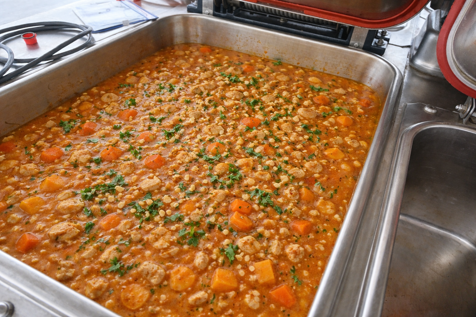 - Hähnchen anbraten Fleisch portionsweise in Öl kräftig anrösten → gibt Tiefe. Herausnehmen.Gemüse anschwitzen Zwiebeln, Knoblauch und Ingwer im gleichen Kessel glasig dünsten.Tomatenmark einrösten Kurz mitrösten (wichtig für Aroma).Karotten & Süßkartoffeln zugeben Einige Minuten mit anschwitzen.Mit Brühe auffüllen Auf ca. 40 Liter Gesamtmenge.Gewürze einrühren Alles gut vermengen.Hähnchen zurückgeben Suppe zum Kochen bringen. Köcheln lassen 30–40 Minuten, bis alles weich ist. Erdnussbutter einarbeiten Vorher mit etwas heißer Brühe glattrühren. Dann in die Suppe einrühren → verhindert KlumpenOptional: Spinat zugeben Kurz mitziehen lassen.Abschmecken Mit Salz, Chili und Zitronensaft feinjustieren.